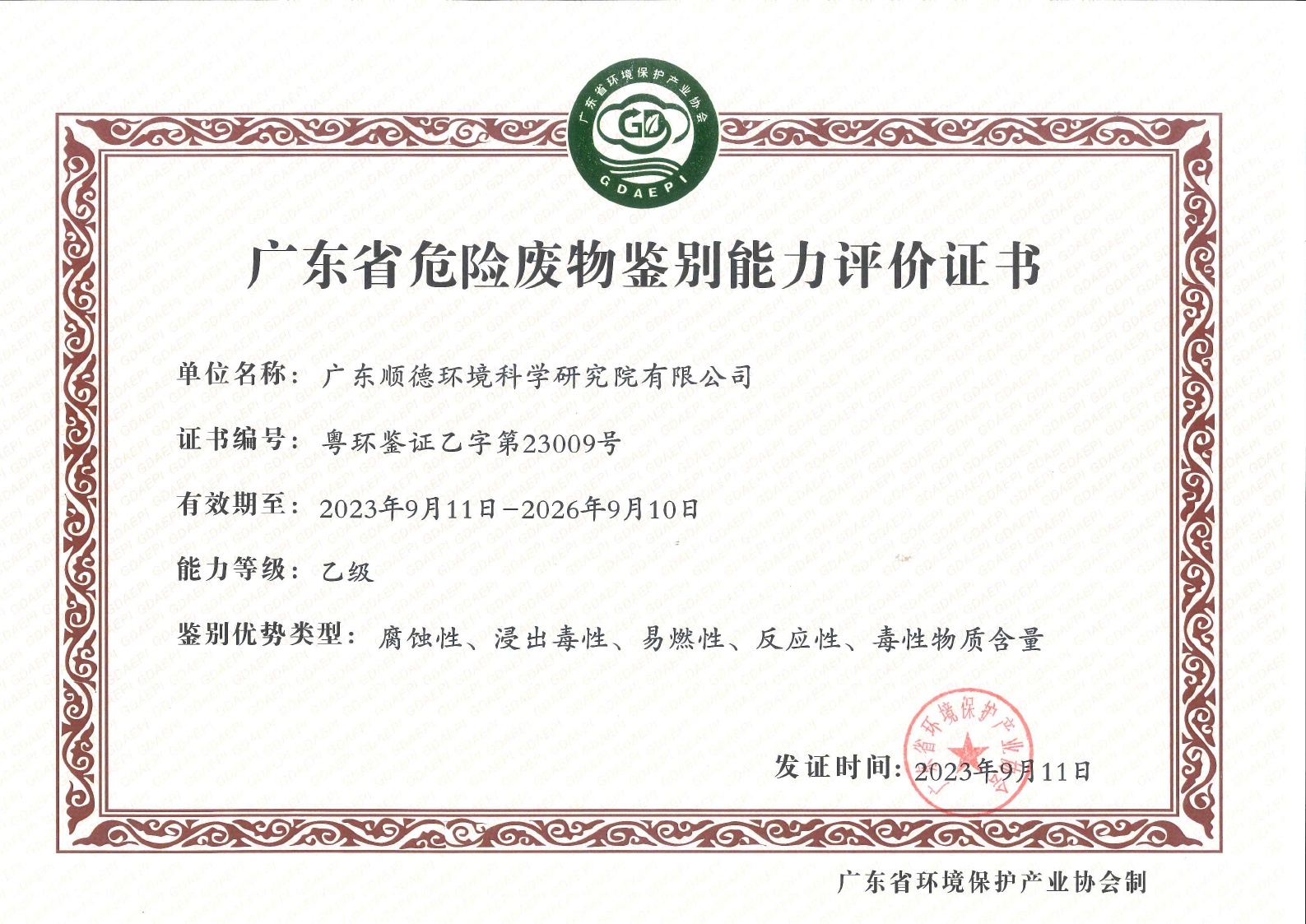 • 廣東省危險廢物鑒別能力評價證書